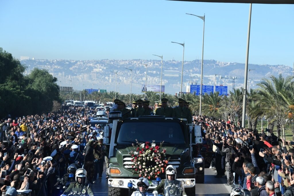 و قد تم نقل جثمان المجاهد احمد قايد صالح الذي كان مسجى بالعلم الوطني ومزينا بباقات من الزهور على متن مركبة عسكرية.